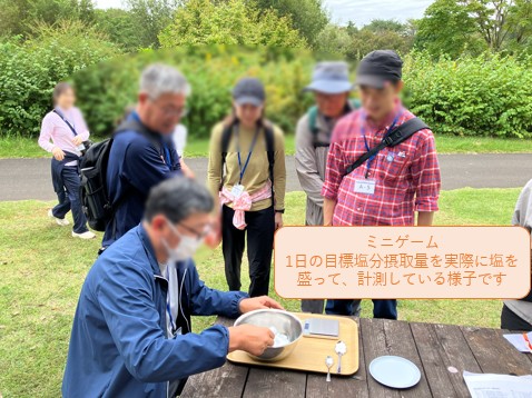チェックポイントでは、クイズやミニゲームを行い、学びながら楽しく歩くことができました。クイズは、糖尿病やご当地に関するクイズが出題されました。ミニゲームでは、パターゴルフと1日の目標塩分摂取量を目指して、実際に塩を盛りつけるという競技がありました。和気あいあいとした雰囲気で楽しく競技に取り組むことができ、両チームとも無事に完歩することができました。